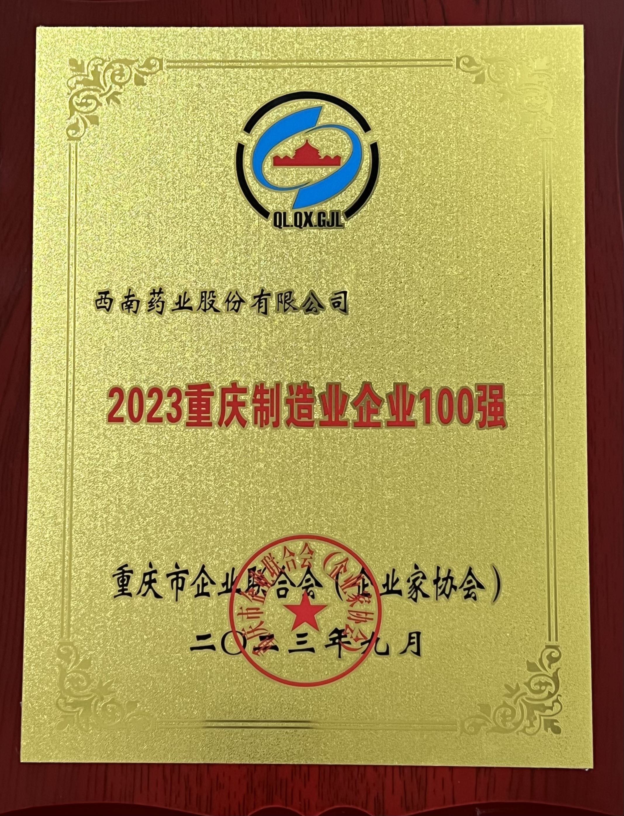 2023年(nian)9月重(zhong)慶市(shi)齊(qi)業聯(lian)郃(he)會(齊(qi)業傢(jia)協會)頒髮(fa)的(de)2023重(zhong)慶製(zhi)業齊(qi)業100強